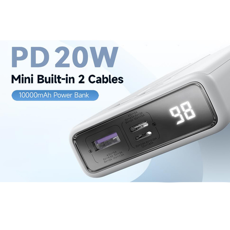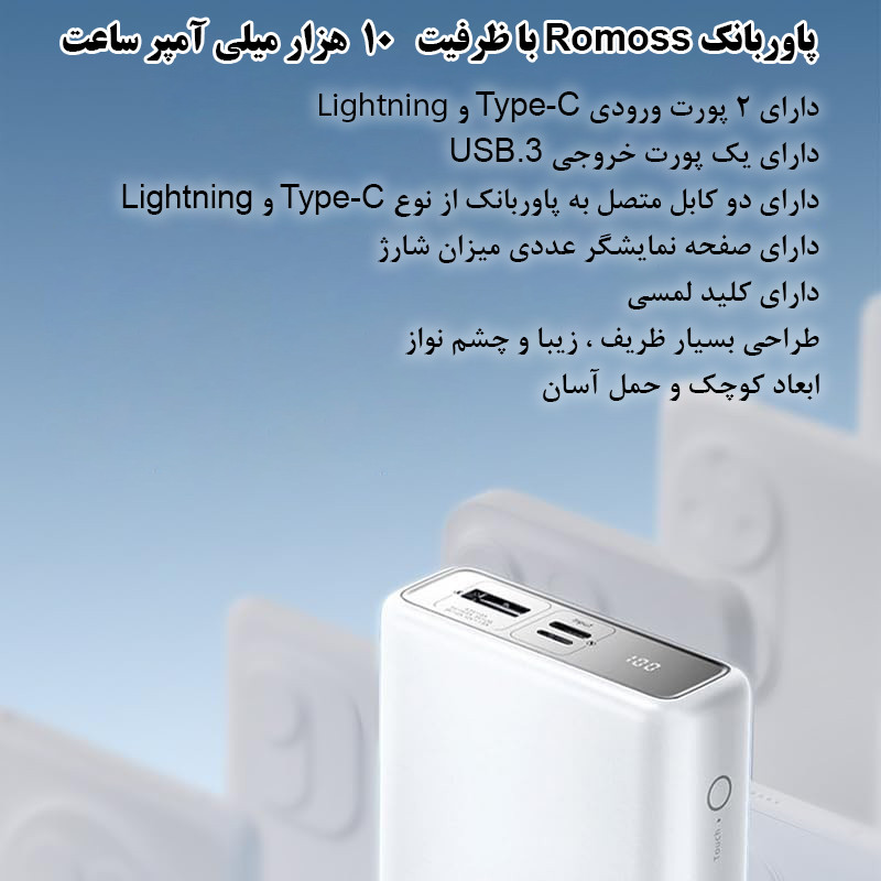 پاوربانک روموس مدل PAC-10 یکی از جدید ترین و خاص ترین پاوربانک های موجود در بازار جهان است. این پاوربانک دارای پورت ورودی Type-C PD و پورت ورودی لایتنینگ برای ورودی شارژ پاوربانک و 1 پورت USB-A برای شارژ موبایل می باشد. در کنار این پورت های کامل ، این پاوربانک دارای 2 کابل متصل از نوع Type-C و Lightning می باشد. همچنین این پاوربانک دارای صفحه نمایشگر عددی میزان شارژ می باشد. طراحی منحصر به فرد این پاوربانک در کنار مطرح بودن برندی معتبر و جهانی ، بر جذابیت و استقبال کاربران افزوده است. پاوربانک روموس مدل PAC-10 دارای کلید لمسی برای روشن کردن می باشد. با نگه داشتن کلید لمسی ، پاوربانک روشن و خاموش می شود