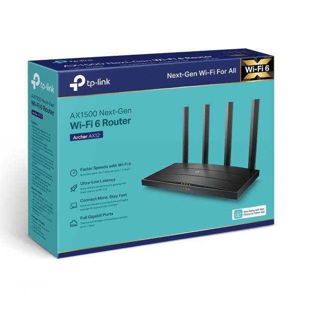 روتر بی سیم و دوباند AX1500 تی پی لینک (TP-Link) مدل Archer AX12 یکی از جدید ترین محصولات این شرکت می باشد. که از آخرین فناوری روز دنیا در شبکه بی سیم یعنی نسل شش وای فای (Wi-Fi) بهره می برد و با داشتن پردازنده 3 هسته ای یکی از بهترین روتر های بازار است. همه پورت های اترنت گیگابیتی به شما امکان می دهند تا از سرعت پهنای باند خود تا 1 گیگابیت بر ثانیه نهایت استفاده را ببرید. رایانه های شخصی ، تلویزیون های هوشمند و کنسولهای بازی خود را به یکی از سه درگاه LAN اترنت گیگابیتی وصل کنید تا اتصالات سیمی سریع و مطمئنی داشته باشید. روتر Archer AX12 با 4 آنتن خارجی با کارایی بالا سیگنال های WiFi را در سراسر خانه شما تقویت می کنند. فناوری Beamforming دستگاه ها را شناسایی میکند و قدرت سیگنال بیسیم را به سمت آنها متمرکز میکند، مخصوصاً برای پریزهایی که قبلاً دسترسی به آنها سخت بود. آخرین پروتکل امنیتی Wi-Fi، WPA3 قابلیت های جدیدی را برای بهبود امنیت سایبری در شبکه های شخصی به ارمغان می آورد. رمزگذاری ایمن تر در ایمنی رمز عبور Wi-Fi و محافظت پیشرفته در برابر حملات Brute-Force برای محافظت از Wi-Fi خانگی شما ترکیب می شود.