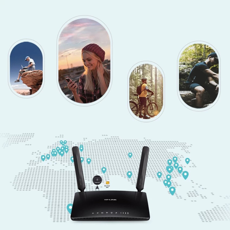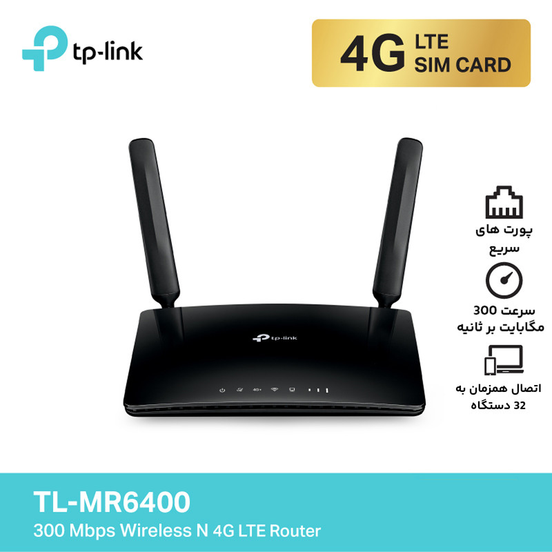مودم MR6400 یک محصول با کیفیت از شرکت تیپی-لینک (TP-LINK) است که تنها با قرار دادن یک سیم کارت نسل چهارم (4G) در آن میتوانید از اینترنت پرسرعت استفاده کنید. این مودم روتر از دو آنتن با 2.4 گیگاهرتزی داخلی برای ایجاد شبکه Wi-Fi و دو عدد آنتن بیرونی برای اتصال به آنتنهای BTS اپراتور بهره می برد و با این ترکیب این دو مجموعه آنتن، میتواند اینترنت سیمکارت شما را به صورت بیسیم در محیط اطرافتان ارایه دهد. برای استفاده از MR6400 تنها کافی است که سیمکارت خود را در مکان مشخص شده قرار دهید و به کمک آداپتور 12 ولتی موجود در جعبه، محصول آن را به برق شهری متصل کنید. در پنل پشتی مودم روتر، چهار عدد پورت LAN از نوع 10/100 مگابیتی وجود دارد که یکی از آنها پورت LAN/WAN است. این پورت به شما کمک میکند دستگاههایی از قبیل مودم کابلی (فاقد قابلیت وایرلس) را به این دستگاه جدید وصل و به کمک آن حتی از اینترنت ADSL هم استفاده کنید. بدون شک مودم 4G تیپی-لینک مدل MR6400 یک محصول نیمه حرفهای است که در واقع نسخهی ساده شدهی Archer MR200 از همین برند است. تفاوت اصلی این دو مدل، پشتیبانی از شبکه بیسیم 5 گیگاهرتز و استاندارد IEEE 802.11ac در مدل Archer MR200 است که در مدل MR6400 به شبکه 2.4 گیگاهرتز و استاندارد IEEE 802.11n تقلیل پیدا کردهاست.