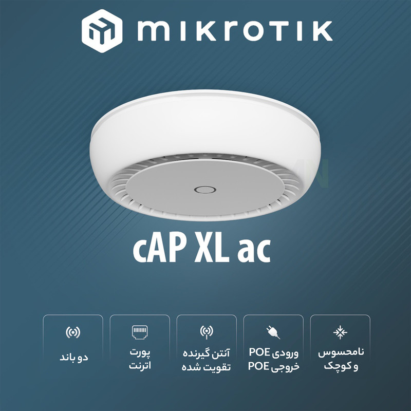 اکسس پوینت سقفی میکروتیک cAP XL ac با نام فنی RBcAPGi-5acD2nD-XL جدیدترین عضو این خانواده می باشد که در اواخر 2021 به بازار عرضه شد و می توان از این محصول قدرتمند برای پوشش وایرلس در تمام فضای خود استفاده کرد . باور داریم که قطعا به زودی در بازار از جایگاه خوبی برخوردار خواهد شد . سخت افزار بسیار مناسب ، کارکرد در دو باند به صورت همزمان ، قابلیت استفاده به عنوان سقفی ، پشتیبانی از POE و امکانات دیگر بسیار خوبی که در ادامه به آن می پردازیم باعث ایجاد محبوبیت برای این اکسس پوینت خواهد شد .اکسس پوینت سقفی میکروتیک cAP XL ac با قابلیت نصب بر روی سقف و دارا بودن ظاهری بزرگتر این امکان را در اختیار شما قرار خواهد داد که پوشش بسیار عالی در فضای خانه ، ویلا و یا محل کار خود داشته باشید . این اکسس پوینت از استاندارد 802.11a/b/g/n/ac پیروی می کند و توانایی پوشش در دو فرکانس 2.4 و 5.8 GHZ را با توان 400 میلی وات به صورت همزمان دارد . cAP XL ac دارای دو پورت اترنت 10/100/1000 می باشد که با توجه به داشتن استاندارد 802.3af/at بر روی POE توانایی داشتن خروجی POE OUT بر روی پورت دوم تا 57 ولت را دارد .اکسس پوینت سقفی میکروتیک cAP XL ac دارای ظرفیت چند برابری نسبت به محصولات قبل از خود می باشد و تفاوت قیمت زیادی با آنها نیز نخواهد داشت پس به همین دلیل توصیه می گردد در صورتی که نیاز به یک پوشش عالی دارید از این محصول بهره ببرید .