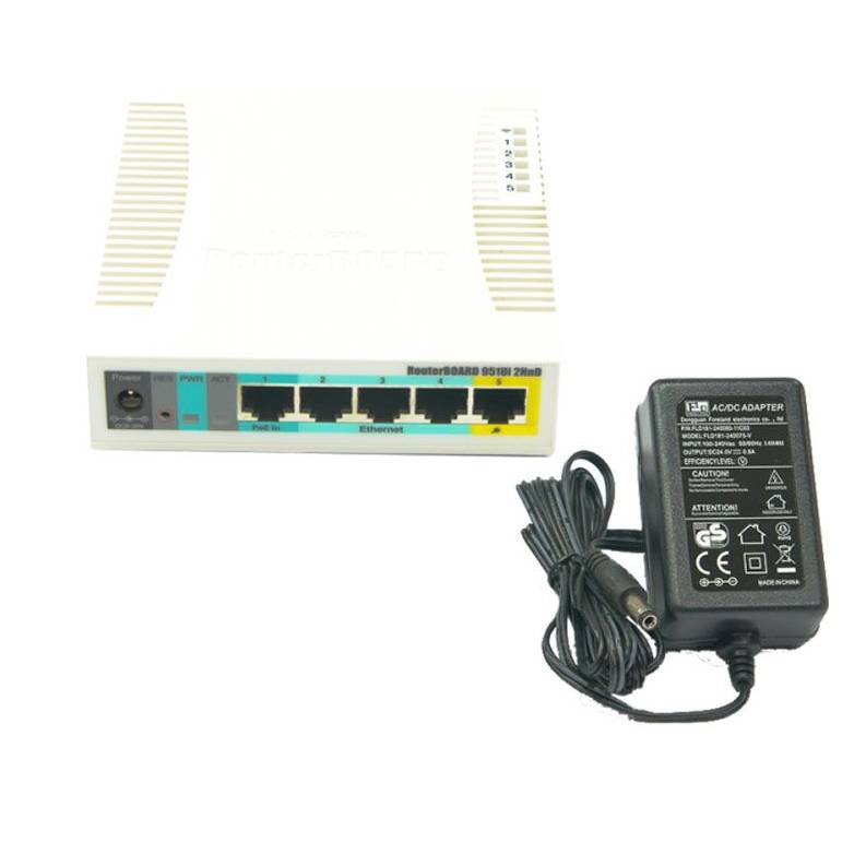 محصول RB951Ui-2HnD از تجهیزات میکروتیک یک دستگاه وایرلس با قابلیت Access Point برای مراکز اداری کوچک است که از نسل جدید پردازنده Atheros با قدرت بیشتر طراحی شده است. این روتر اکسس پوینت 5 پورت اترنت و کارت وایرلس با توان خروجی 1000mW که از استاندارد 802.11b/g/n پشتیبانی می کند را دارا می باشد. همچنین این دستگاه دارای یک پورت USB می باشد. شایان به ذکر است که سرعت پردازنده این دستگاه 600MHz و 128MB حافظه رم و یک خروجی PoE برروی پورت شماره 5 است که می توان دستگاه های دیگر را با استفاده از آن روشن کرد. حداکثر جریان بار برروی این پورت 500mA می باشد. محتویات این پکیج روتربرد 951Ui-2HnD با بدنه پلاستیکی و آداپتور می باشد.