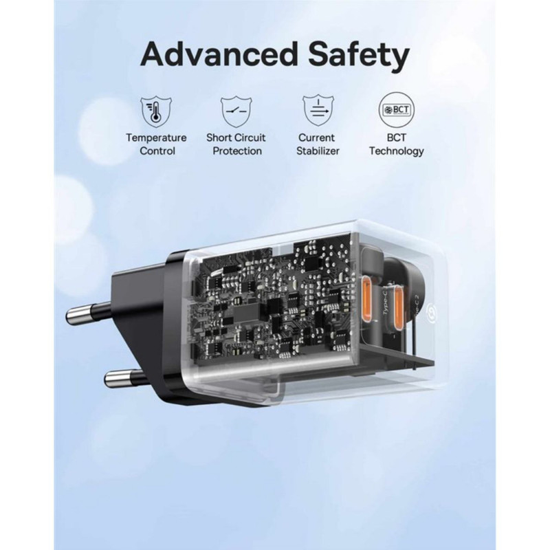 اگر به شارژ سریع دستگاه های خود اهمیت می دهید، شارژر Baseus GAN5 Pro مدل CCGAN40CE-M مطمئناً برای شما جذاب خواهد بود. 2 پورت ارائه می دهد و تجهیزات شما را برای شارژ مجدد در کمترین زمان آماده می کند. علاوه بر این، فناوری BCT و طیف وسیعی از ویژگیهای ایمنی، محافظت در برابر آسیب را تضمین میکند و استفاده از نیترید گالیوم (GaN) کاهش اندازه شارژر را برای حمل و نقل و ذخیرهسازی راحت ممکن کرده است. شارژ سریع: دیگر لازم نیست خیلی منتظر بمانید تا تجهیزات شما برای استفاده آماده شود. شارژر دیواری Baseus برای بازده شارژ بیشتر، آمپر را به دستگاه متصل تنظیم می کند. علاوه بر این، 2 پورت USB-C با مجموع توان 40 وات ارائه می دهد، بنابراین می توانید همزمان 2 دستگاه را شارژ کنید. در نتیجه مک بوک ایر شما در 60 دقیقه به 70 درصد و آیفون 14 پرو در حدود 30 دقیقه به 56 درصد می رسد. تکنولوژی GaN: در طول تولید Baseus GaN 5 Pro، از نیترید گالیوم استفاده شد، بنابراین شارژ کارآمدتر است و شارژر خیلی سریع گرم نمی شود. علاوه بر این، این محصول فضای زیادی را اشغال نمی کند - می توانید با موفقیت آن را به یک نوار برق وصل کنید. برای مسافرت نیز عالی خواهد بود، می توانید به راحتی شارژر را در کوله پشتی یا کیف خود قرار دهید. استفاده ایمن: بدون نگرانی از آسیب دیدن تجهیزات خود از شارژر بیسوس استفاده کنید. این محصول در برابر اضافه ولتاژ، جریان بیش از حد، میدان الکترومغناطیسی، اتصال کوتاه و غیره محافظت می کند. علاوه بر این، شارژر در برابر شعله مقاوم است و فناوری BCT دمای محصول را کنترل می کند و از گرم شدن بیش از حد آن جلوگیری می کند. علاوه بر این، Trickle Charging از دستگاه در برابر آسیب محافظت می کند.